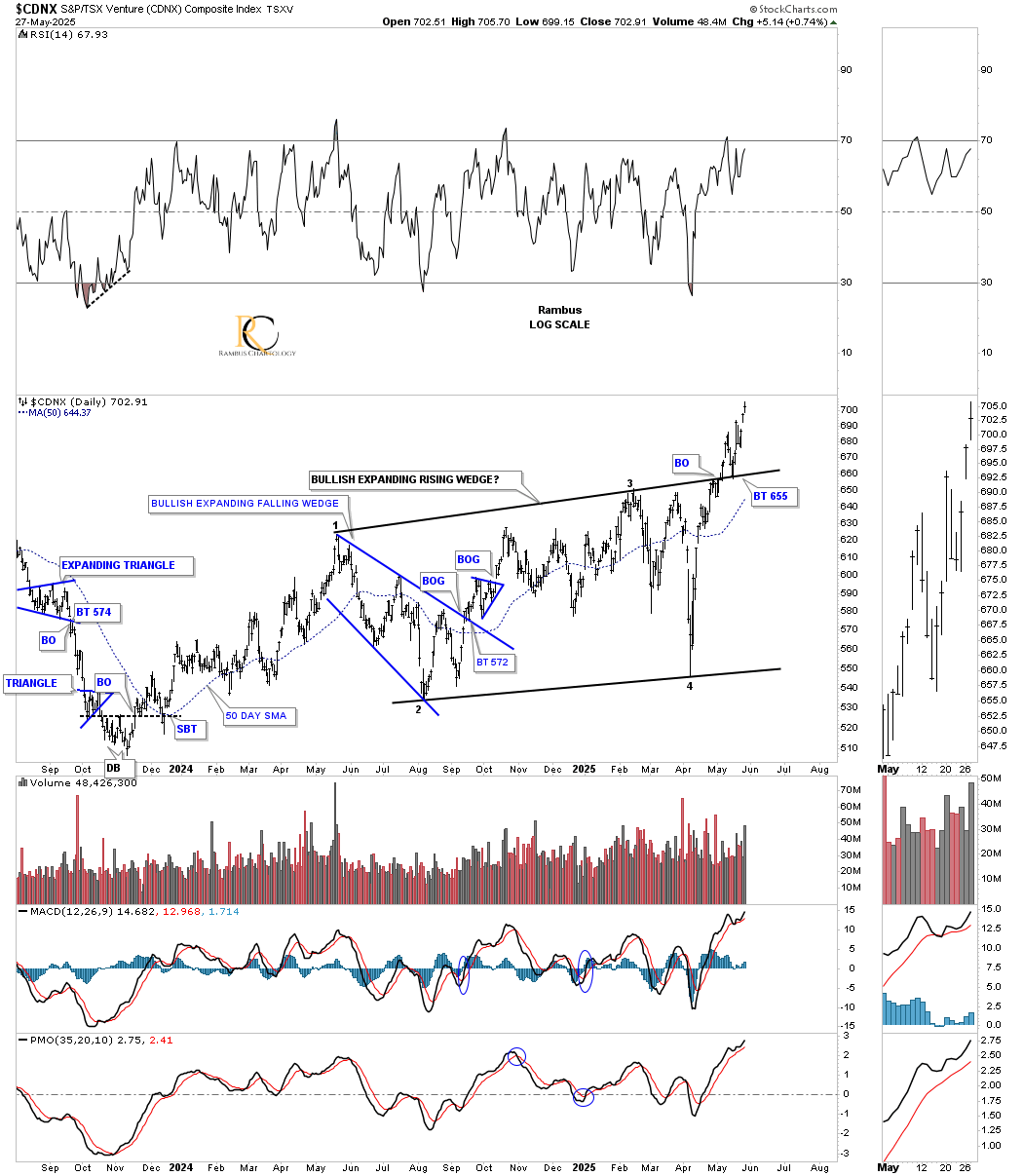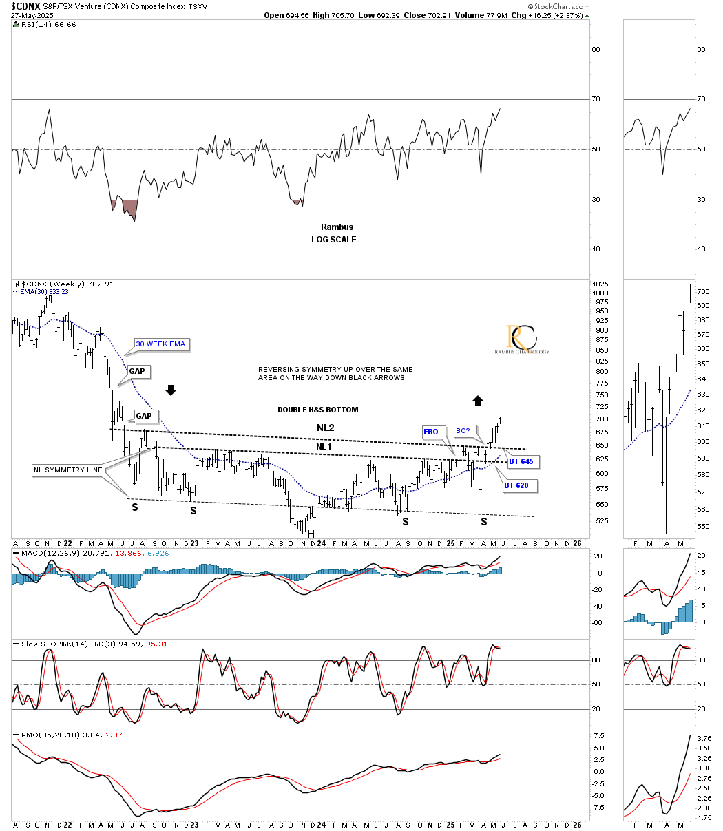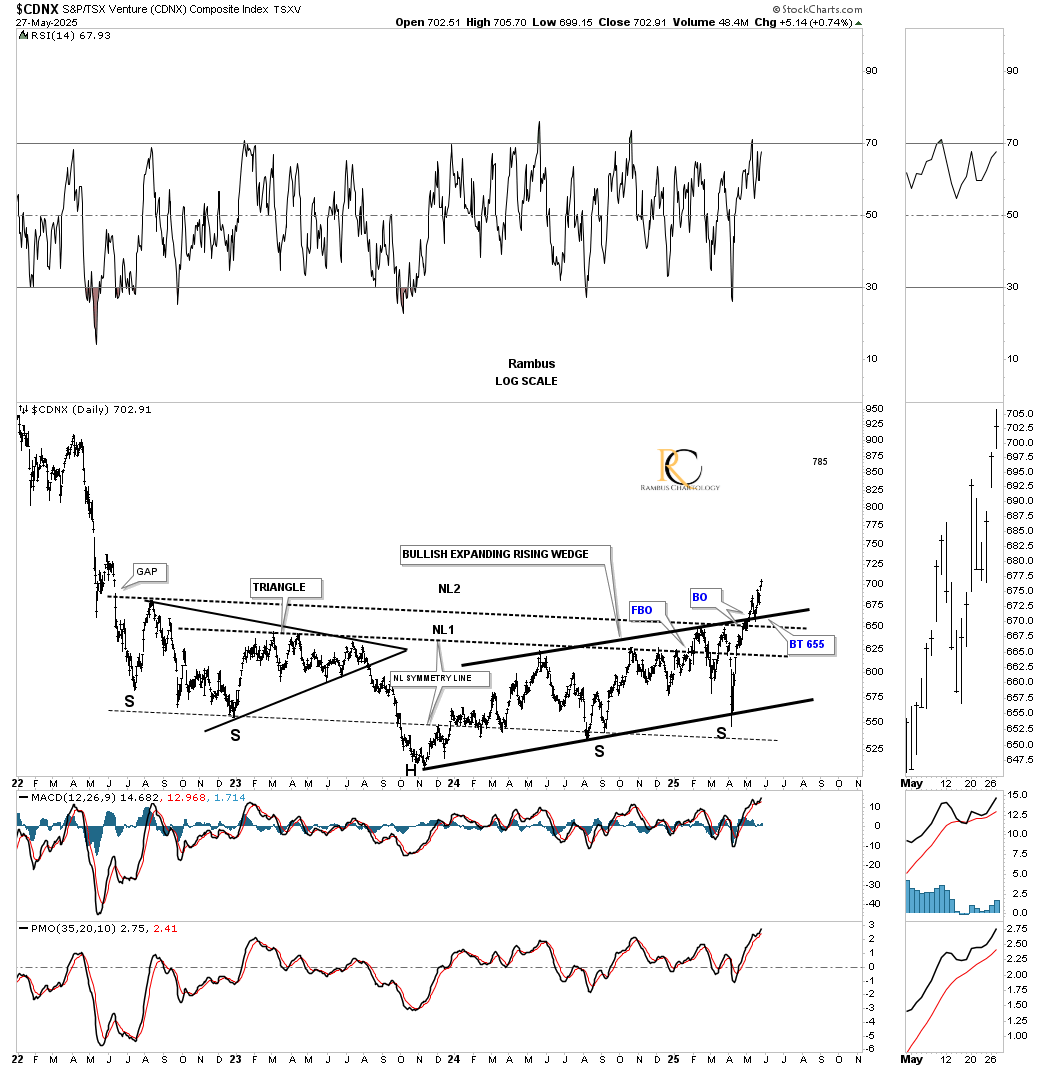 This monthly history chart shows that the month of May has been very good for the CDNX, continuing its breakout move. It's always possible we could get a backtest, like in 2012, but there's no way to know. Looking at the other trading ranges, with the exception of the 2012 backtest, most don't show much of a backtest, if any. Once the breakout occurred, it was off to the races.